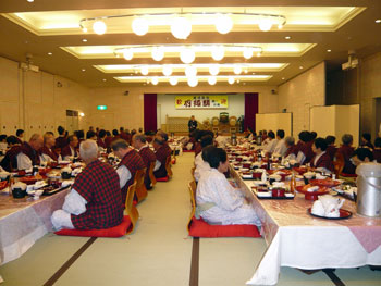 以来今年で五十年を迎える。現在では参加寺院百五十。参加者は全国から毎年五千名を迎える。毎年参加する人も多く、参加者同士の交流も生まれている。持参する米一升は「一生法を聞く」に因(ちな)んでいる。読経(おつとめ)・法話と続き、夕食では演芸を楽しむことができる。これも「お世話になった方に楽しんでいってもらいたい」という静枝社長の発案である。