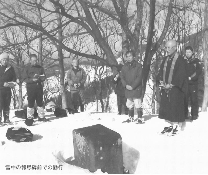 尾神殉難のあった前日の三月十一日は有縁の講師を招いてお話を聞き、そのテーマについて話し合います。翌十二日はいまだ雪深い尾神嶽中腹の報尽碑を有志で雪中参拝します。地表から二mを超える報尽碑は、年によりすっぽり常に埋まっていたり上部が見えていたり、その辺りは新雪があったり好天だったりさまざまです。ここ二、 三年は六十人ほどの参加者を得て、二十人ほどの方たちに雪中参拝をお勤めいただいています。