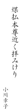 本山報恩講にお誘い頂いて、十一月二十七日の朝を迎えた。小雨の降る淋しい日だけど、私の胸は時めく晴ればれしい朝でした。糸魚川インターで満面の笑顔で別院の千名さんが迎えて下さいました。天気も京都に近づくにつれて晴天となり、途中立ち寄った彦根は最高の天気でした。バスの中は人数は少なかったけれども楽しく過ごさせて頂いた。その日の夜は家では頂けないイタリアン料理を頂き、ゆっくりと休みました。二十八日は待ちに待った報恩講。歳(とし)は重ねていても本山の報恩講に出会えたのは五回目です。何回出会えても、この喜びは人それぞれ違いますが、私には胸打つものがあります。回を重ねるたびに思う報恩講にお会い出来る事の重さ。あの広い御影堂に波うつ坂東曲。(ばんどうぶし)二時間余りのお勤め。私自身、身を洗う気持ちです。今までの人生をその時だけでも振り返り、大病もなく人並みの生活が出来たのは先祖の「おかげさま」だと深く感謝しています。その思い、その気持ちを来年のこの日まで持ち続けたいものです。でも時間が経つにつれて、自分自身の我ままが出て来て、それ以上の物を望み、自分をどうする事も出来なくなり、他人様を傷付けてしまう事があり情けなくなります。でもこの出会いを頂き、一日でもその事に気付く事が出来、これからもこの出会いを大切にして、これからは周りの人達に愛され、念仏を称える心豊かな生活を送りたいものです。