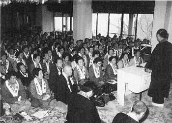 以来今年で五十年を迎える。現在では参加寺院百五十。参加者は全国から毎年五千名を迎える。毎年参加する人も多く、参加者同士の交流も生まれている。持参する米一升は「一生法を聞く」に因(ちな)んでいる。読経(おつとめ)・法話と続き、夕食では演芸を楽しむことができる。これも「お世話になった方に楽しんでいってもらいたい」という静枝社長の発案である。