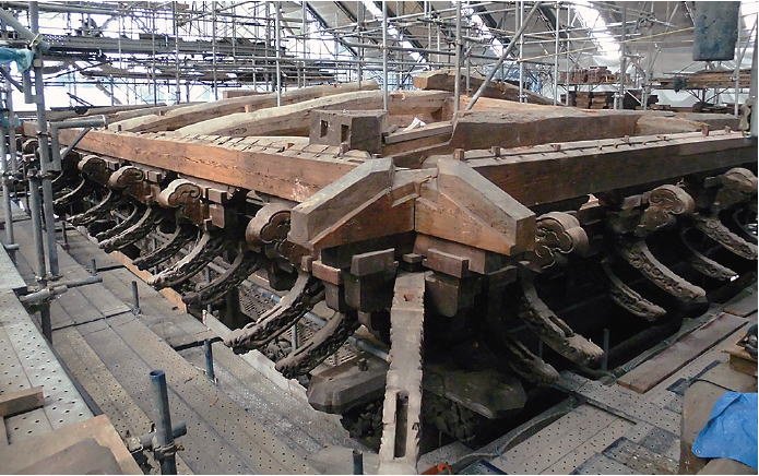 現在の大門(山門)は、一八〇三(享和三)年に消失したあと、一八二七(文政十)年に総欅で再建されました。棟梁は竹澤志摩則行で、細部に中国の故事や十二支彫刻が施され文化的歴史的に高く評価されています。付属の塀と共に国指定登録有形文化財に認定されています。 昨年、高田別院に赴任をしてすぐに、大門の工事の経過を視察する機会を得て素屋根にあがらせていただきました。たくさんの職人さんが作業を進める中説明を受けたことでございます。一本一本の材木を見ながらこの地域のご門徒の念仏の道場を造るための意気込み、息吹を感じたことでございます。